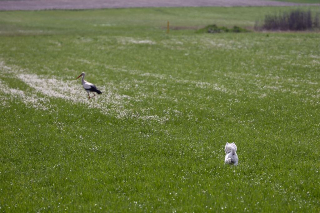 Był sobie bocian, nazwijmy go Stefan. Bocian Stefan korzystając z ciepłego, kwietniowego popołudnia postanowił udać się na łąkę, aby coś sobie spożyć.  Stefan wystrojony na tę okazję, w swoje najlepsze piórka, pełen bocianiej elegancji przechadzał się po łące szukając smakowitych kąsków, gdy nagle spostrzegł, że pędzi ku niemu niczym piorun kulisty west terier płci żeńskiej, nazwijmy ją Megi. Westy z natury to psy dość uparte i jak coś sobie wkręcą, ciężko jest je od tego odwieść, bo choć psy to niewielkie, to ich serca są naprawdę ogromne. Megi to prawdziwy pies na ptaki, z jakiegoś powodu drażni ją wszystko co lata, nie wyłączając samolotów. Więc kiedy dojrzała stojące pośrodku łąki ptaszysko, rzuciła się pędem ku niemu, bo co tu będzie taki łaził na tej łące, która prawie do niej należy, a i pewnie coś do jedzenia zabierze. Nieco zwątpiła psina westina, kiedy wraz ze zbliżaniem się ptaszysko zaczęło zwiększać swój rozmiar. Na chwilę przyhamował, stanęła na dwóch tylnych łapach by nabrać dystansu, po czym ruszyła do finałowej szarży. Stefan początkowo próbował usunąć się z drogi pędzącej ku niemu bestii. W końcu jednak, widząc, że ma do czynienia z wyjątkowym natrętem, rozłożył skrzydła i poleciał, w końcu łąka jest duża, więc po co wdawać się w niepotrzebne awantury, zresztą z takimi dzikusami i tak nie ma co dyskutować.  Widząc to Megi triumfalnie zaszczekała w kierunku uciekającego bociana, po czym ruszyła w stronę obserwującego to zdarzenie człowiek krzycząc „Ptaszysko przegnane, jesteś Aru uratowany!”.