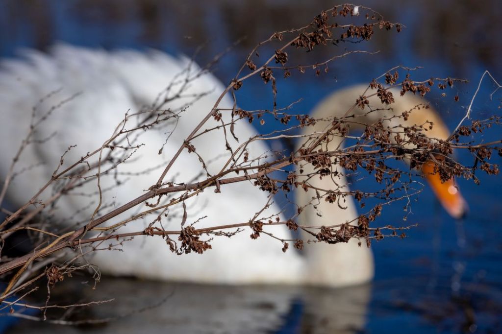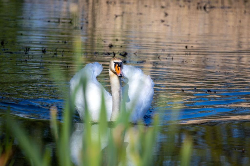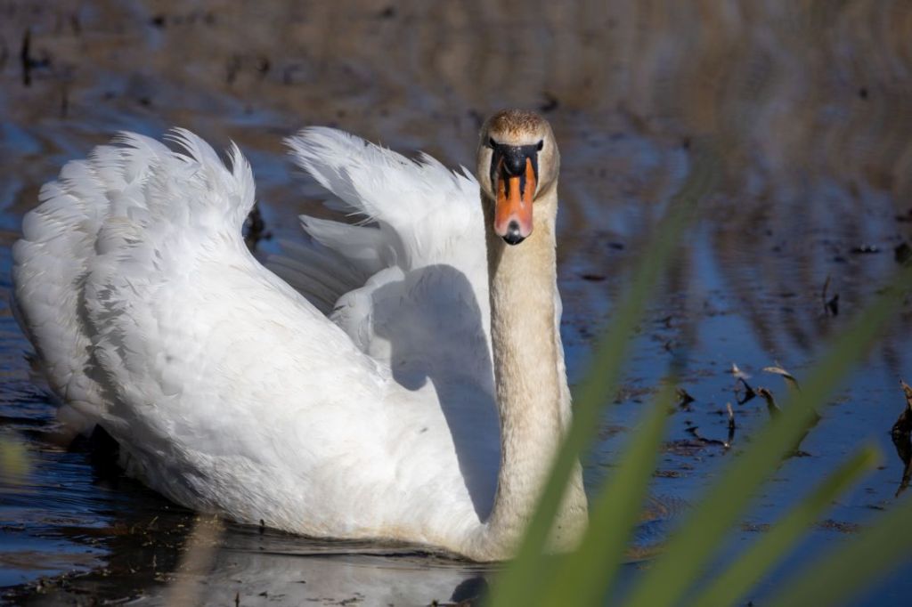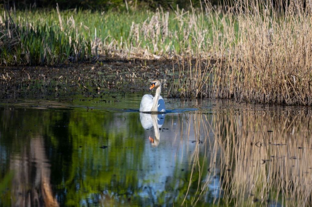 Kiedy podczas wczorajszego spaceru próbowałem wyśledzić żaby hałasujące w mijanym bajorze, nagle z szuwarów wyłonił się łabędź. Dostojne, ale stanowczo, zaczął sunąc w moją stronę udając jednocześnie, że kompletnie nie jest mną zainteresowany. Powoli zbliżył się do mnie, głęboko i stanowczo spojrzał mi w oczy, po czym, bardzo nie śpiesząc się popłynął dalej. Z poprzednich lat pamiętam, że w tych szuwarach, z których się wynurzył, łabędzie mają swoje gniazdo, więc to co mnie spotkało, to nic innego jak patrol pana łabędzia, który miał na celu przyjrzenie się intruzowi, a w razie potrzeby pogonienie go. Potrzeby takiej nie było. Zrobiłem kilka poniższych zdjęć i powoli się oddaliłem